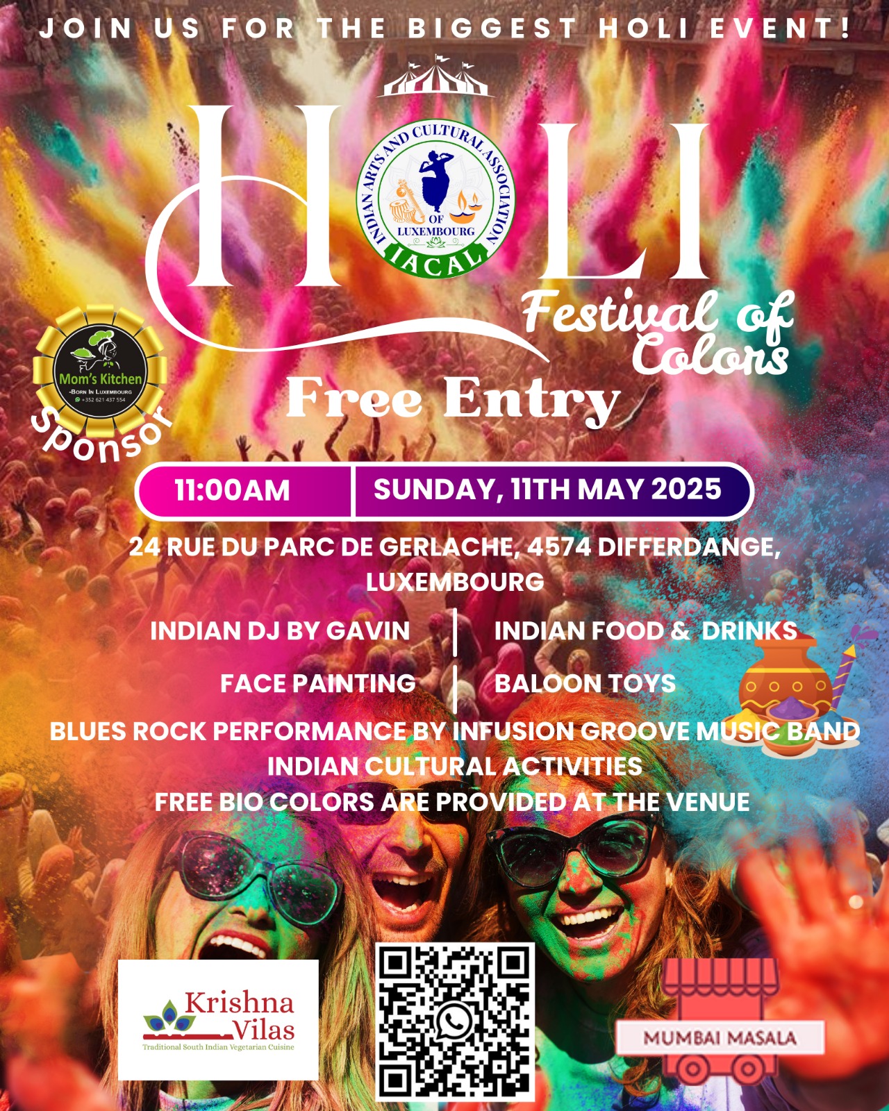 IACAL(Indian Arts and Cultural Association of Luxembourg) is performig Holi - Festival of colors in association with Differdange Commune. It is open everyone and Entry is Free. You can enjoy finger licking Indian street food, non vegeterian food and drinks. Mesmerize yourself by indulging in to Indian DJ and spraying colors on each other.
